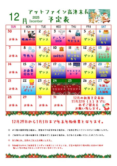 はじめまして。アットファイン高津末長です。 12月より高津末長もブログを掲載させていただきます。 一発目は遅くなりましたが12月のレクカレンダーになります。 今回はこれで以上となります。 次回の更新では高津末長での子どもたちの様子を掲載します。 ... -