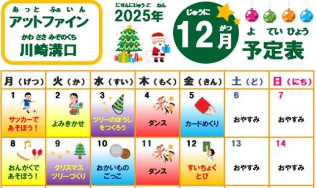 こんにちは! アットファイン川崎溝口(児童発達支援)です!! 本日からブログのスタートです🎄 本日は12月のお楽しみ会の予定をご紹介します! クリスマスの季節なので、クリスマスにまつわるゲームや制作が盛りだくさん💕 予定表を見て楽しみにし... -